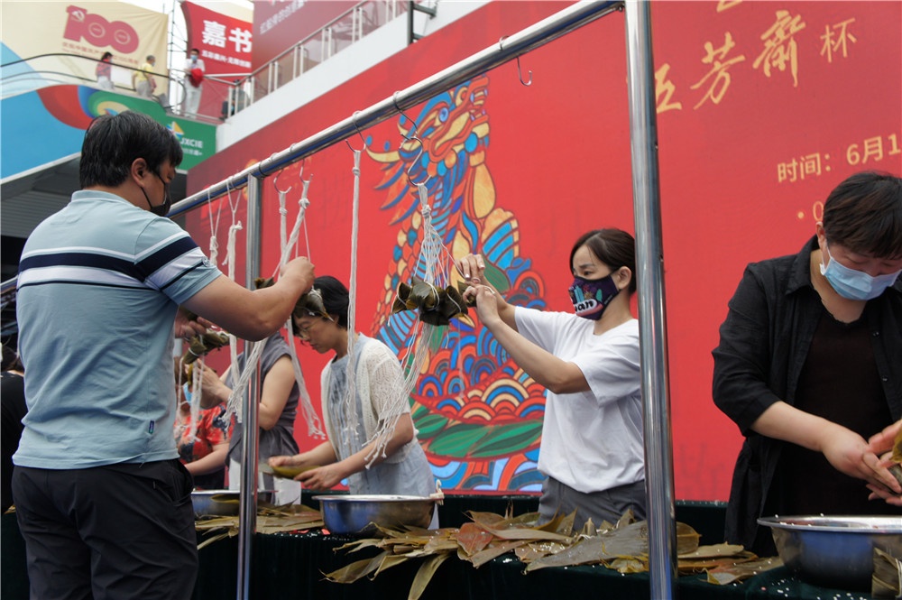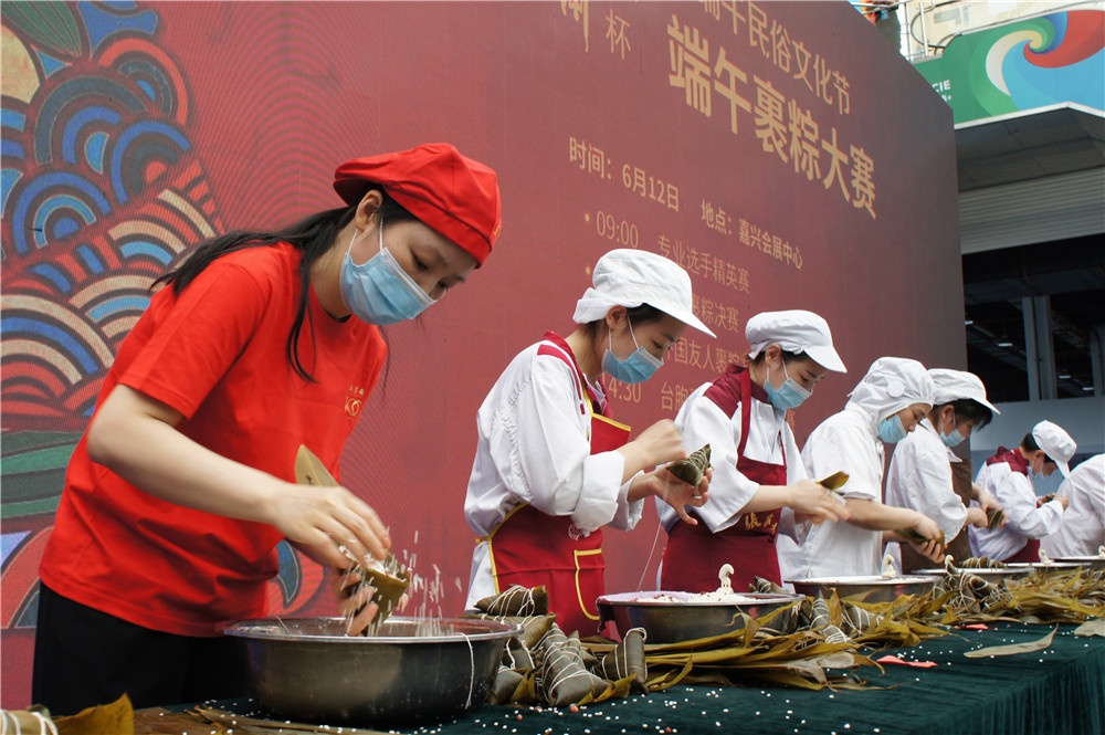 6月12日,嘉興國(guó)際會(huì)展中心內(nèi),共進(jìn)行了專業(yè)組、市民組、海外組和臺(tái)胞組四組精彩紛呈的裹粽比賽。