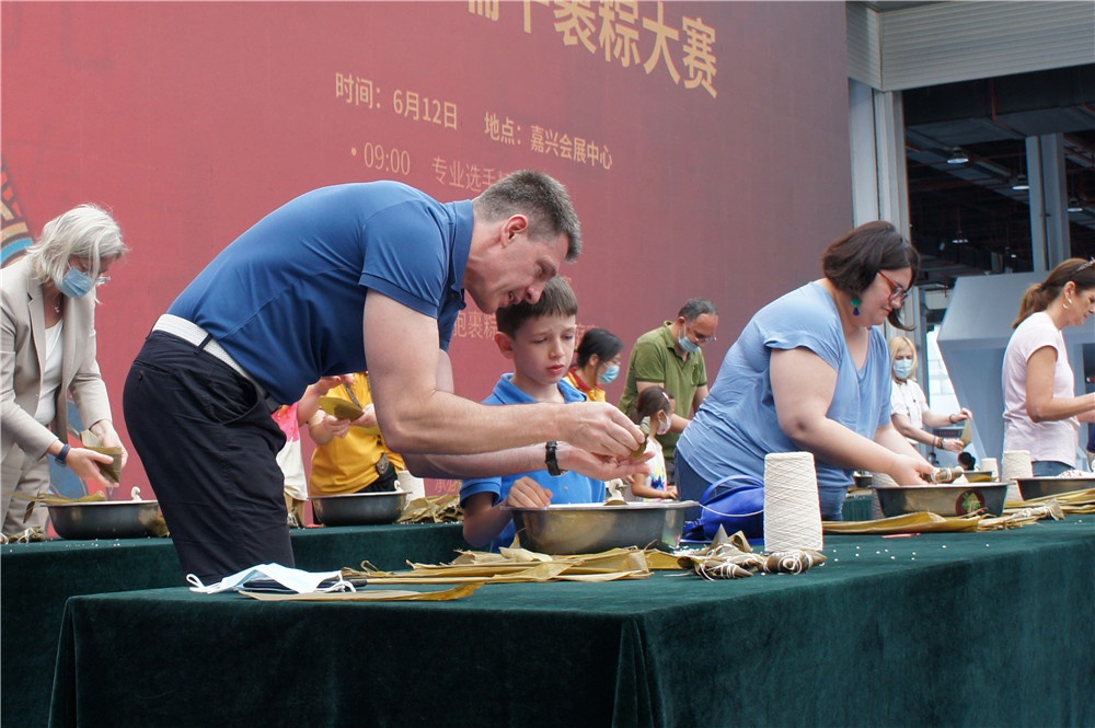 相較于早上兩場(chǎng)比賽的激烈緊張,下午這場(chǎng)外國(guó)友人裹粽友誼賽氣氛則輕松有趣多了。大家在專業(yè)裹粽師的指導(dǎo)下學(xué)習(xí)裹粽,體驗(yàn)濃濃的嘉興端午習(xí)俗。