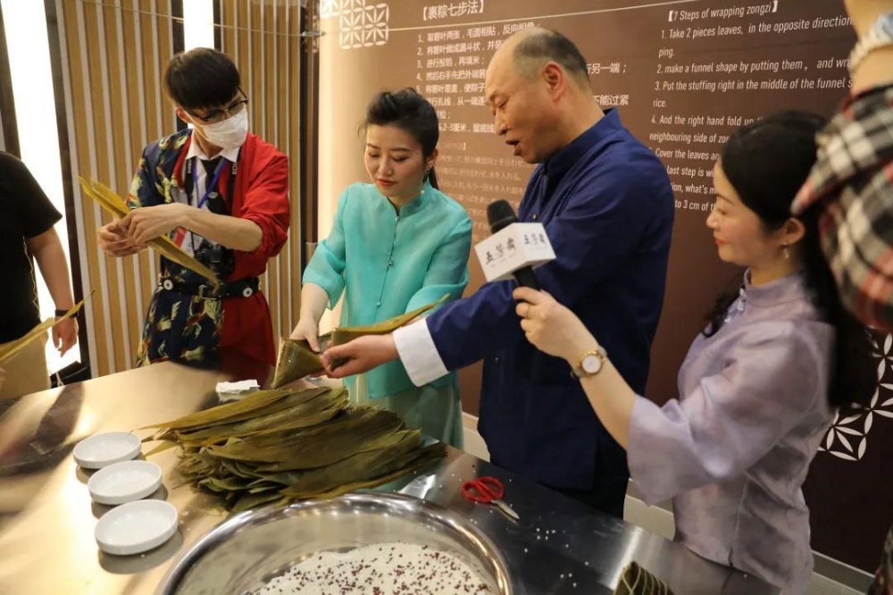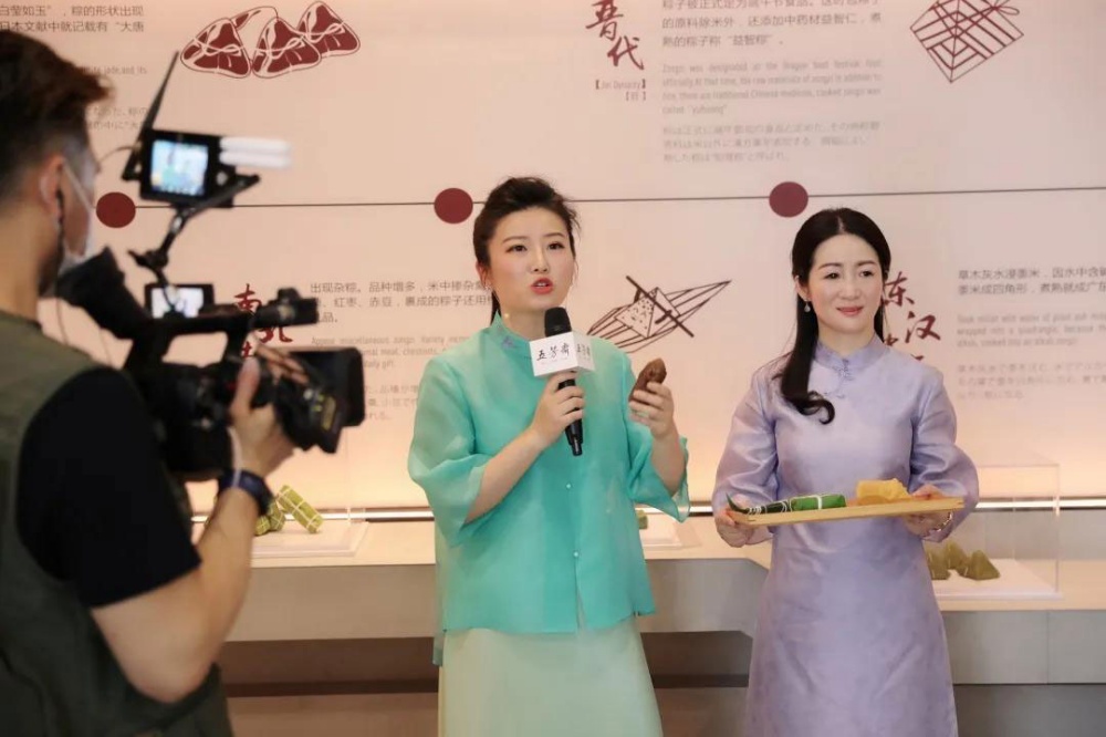 浙江五芳齋實業股份有限公司副總經理徐煒帶領主持人和嘉賓來到粽藝長廊,參觀粽子從淘米、切肉到裹粽等生產流程,從糯源、糯藝、糯心三個維度感受五芳齋的拳拳匠心,深入了解中國源遠流長的粽子文化。