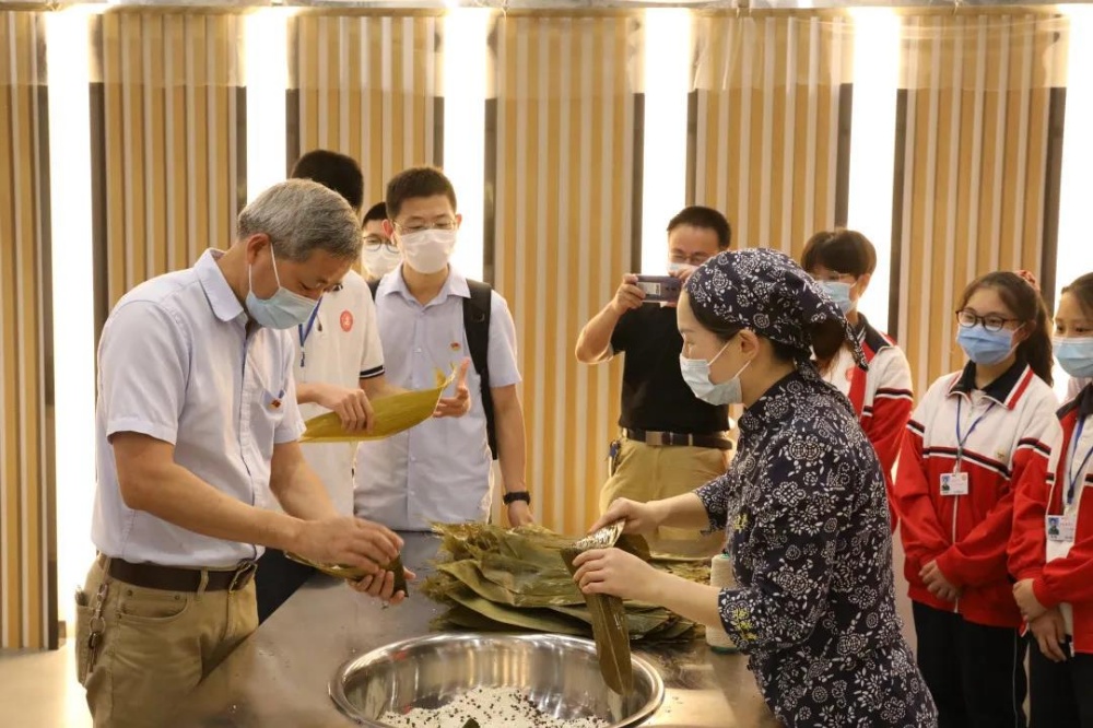 “裹粽子有七個步驟,第一步取兩張箬葉,毛面相貼反向相疊,葉柄在兩側,從靠右三分之二的地方對折成60度的倒漏斗形狀……”在粽藝師的指導下,一只只頗有模樣的粽子在同學們的手中誕生。